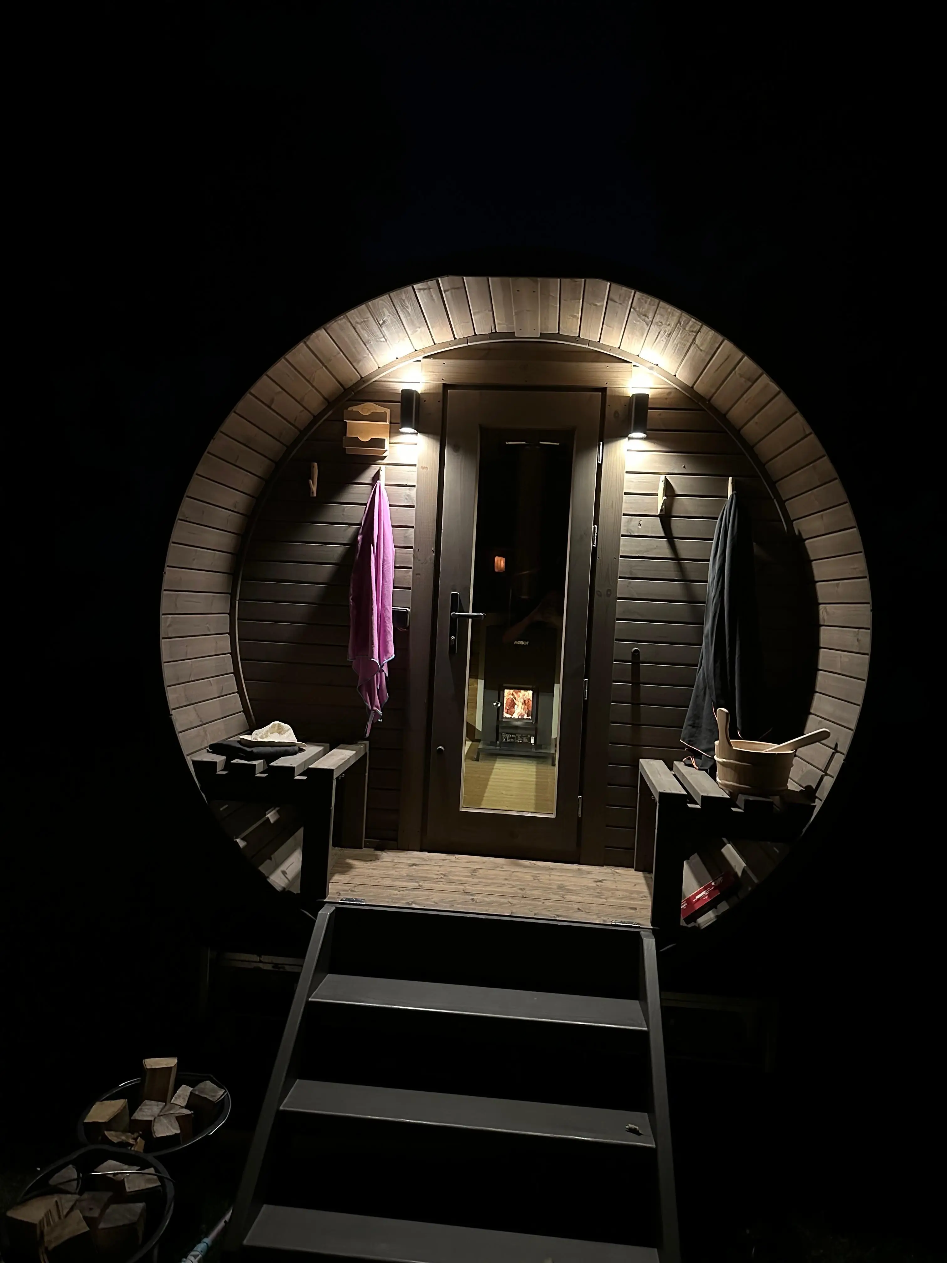 Unsere Saunen haben Holzöfen mit Sichtfenster – Holz wird mitgeliefert.